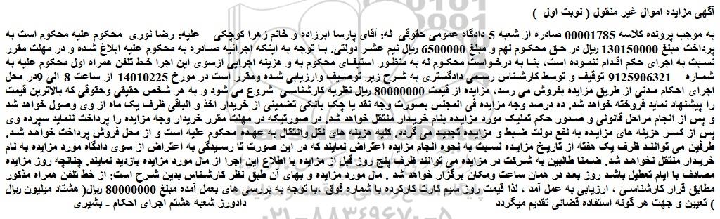 به موجب پرونده کلاسه 00001785 صادره از شعبه 5 دادگاه عمومی حقوقی له: آقای پارسا ابرزاده و خانم زهرا کوچکی علیه: رضا نوری محکوم علیه محکوم است به پرداخت مبلغ 130150000 ریال در حق محکوم لهم و مبلغ 6500000 ریال نیم عشر دولتی. با توجه به اینکه اجرائیه صادره به محکوم علیه ابلاغ شده و در مهلت مقرر نسبت به اجرای حکم اقدام ننموده است، بنا به درخواست محکوم له به منظور استیفای محکوم به و هزینه اجرایی ازسوی این اجرا خط تلفن همراه اول محکوم علیه به شماره 9125906321 توقیف و توسط کارشناس رسمی دادگستری به شرح زیر توصیف وارزیابی شده ومقرر است در مورخ 14010225 از ساعت 8 الی 9در محل اجرای احکام مدنی از طریق مزایده بفروش می رسد، مزایده از قیمت 80000000 ریال نظریه کارشناسی شروع می شود و به هر شخص حقیقی وحقوقی که بالاترین قیمت را پیشنهاد نماید فروخته خواهد شد. ده درصد وجه مزایده فی المجلس بصورت وجه نقد یا چک بانکی تضمینی از خریدار اخذ و الباقی ظرف یک ماه از وی وصول خواهد شد و پس از انجام مراحل قانونی و صدور حکم تملیک مورد مزایده بنام خریدار منتقل خواهد شد. در صورتیکه در مهلت مقرر خریدار وجه مزایده را پرداخت ننماید سپرده وی پس از کسر هزینه های مزایده به نفع دولت ضبط و مزایده تجدید می گردد. کلیه هزینه های نقل وانتقال به عهده محکوم علیه است و از محل فروش پرداخت خواهد شد. طرفین می توانند ظرف یک هفته از تاریخ مزایده نسبت به نحوه انجام مزایده اعتراض نمایند که در این صورت تا رسیدگی به اعتراض از سوی دادگاه مورد مزایده به نام خریدار منتقل نخواهد شد. ضمنا طالبین به شرکت در مزایده می توانند ظرف پنج روز قبل از مزایده با اطلاع این اجرا از مال مورد مزایده بازدید نمایند. چنانچه روز مزایده مصادف با ایام تعطیل باشد روز بعد در همان ساعت ومکان برگزار خواهد شد . مال مورد مزایده و بهای آن طبق نظر کارشناس بدین شرح است: از خط تلفن همراه مذکور مطابق قرار کارشناسی ، ارزیابی به عمل آمد ، لذا قیمت روز سیم کارت کارکرده با شماره فوق ،با توجه به بررسی های بعمل آمده مبلغ 80000000 ریال( هشتاد میلیون ریال ) تعیین و جهت هر گونه استفاده قضائی تقدیم میگردد دادورز شعبه هشتم اجرای احکام - بشیری