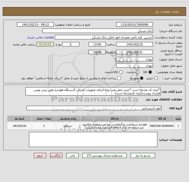 شرح کلی نیاز: *ایران کد مشابه است *خرید،حمل،نصب وراه اندازی تجهیزات کنترلی 3دستگاه هواساز طبق پیش نویس قرارداد پیوست(ایران کدمشابه است)