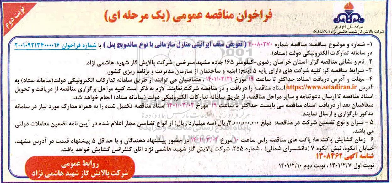 1- شماره و موضوع مناقصه: مناقصه شماره 40080270 (تعویض سقف ایرانیتی منازل سازمانی با نوع ساندویچ پنل) با شماره فراخوان 2001092134000016 در سامانه تدارکات الکترونیکی دولت ستاد