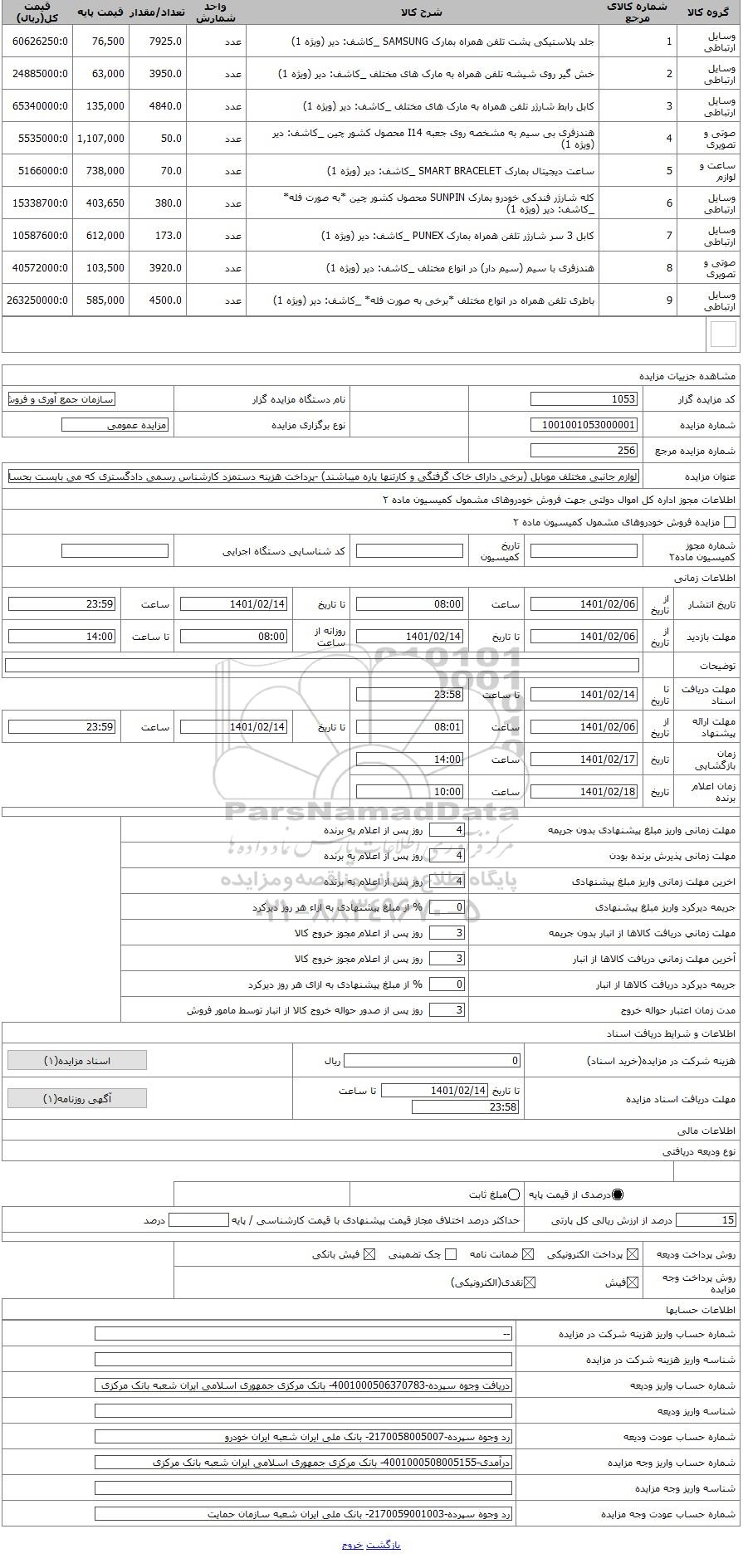 مزایده عمومی مزایده ، لوازم جانبی مختلف موبایل (برخی دارای خاک گرفتگی و کارتنها پاره میباشند) -پرداخت هزینه دستمزد کارشناس رسمی دادگستری که م برگزار میگردد. از کلیه افراد متخصص و شرکتهای واجد شرایط دعوت به عمل میآید تا در این مزایده با کد خبرگزاری پارس نماد : 4460178 شرکت نمایند تاریخ شروع مزایده : 1401/02/06 مهلت شرکت در مزایده: تا پایان روز 1401/02/14