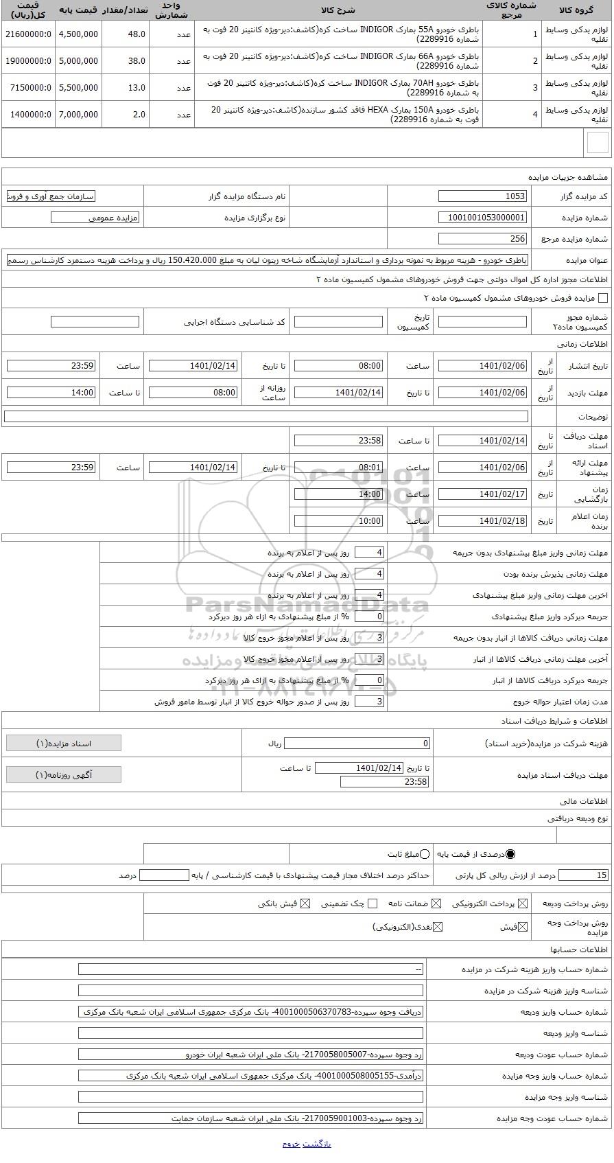 مزایده عمومی مزایده ، باطری خودرو - هزینه مربوط به نمونه برداری و استاندارد آزمایشگاه شاخه زیتون لیان به مبلغ 150.420.000 ریال و پرداخت هزینه برگزار میگردد. از کلیه افراد متخصص و شرکتهای واجد شرایط دعوت به عمل میآید تا در این مزایده با کد خبرگزاری پارس نماد : 4460275 شرکت نمایند تاریخ شروع مزایده : 1401/02/06 مهلت شرکت در مزایده: تا پایان روز 1401/02/14