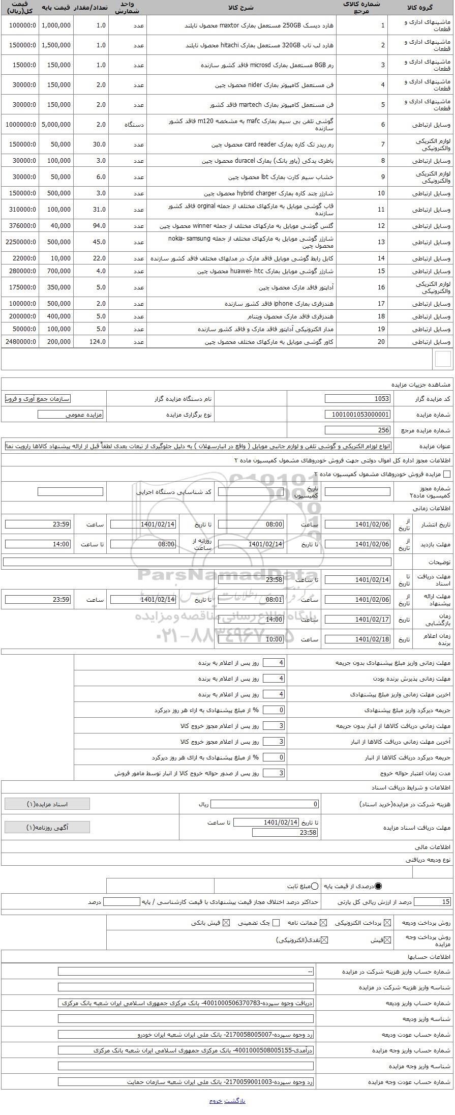 مزایده ، انواع لوزام الکتریکی و گوشی تلفن و لوازم جانبی موبایل ( واقع در انبارسهلان ) به دلیل جلوگیری از تبعات بعدی لطفاً قبل از