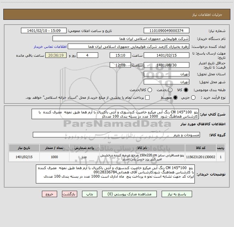 شرح کلی نیاز: پتو 100*145 CM رنگ آبی میکرو خاصیت کندسوزی و آنتی باکتریال با آرم هما طبق نمونه مصرف کننده با کارشناس هماهنگ شود 1000 عدد در بسته بندی 100 عددی