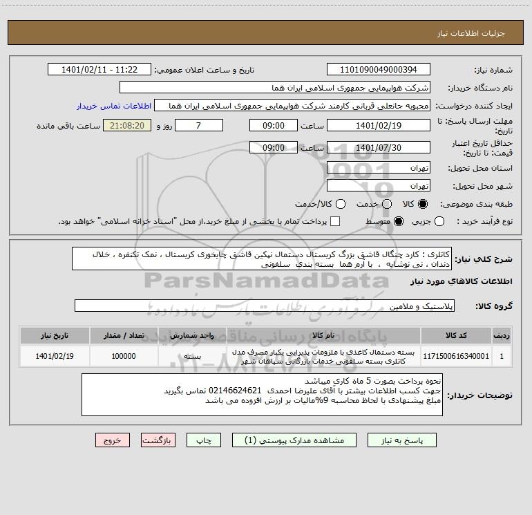 شرح کلی نیاز: کاتلری : کارد چنگال قاشق بزرگ کریستال دستمال نپکین قاشق چایخوری کریستال ، نمک تکنفره ، خلال دندان ، نی نوشابه ، با آرم هما بسته بندی سلفونی