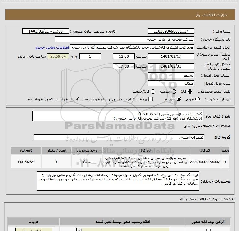 نام دستگاه خریدار:شرکت مجتمع گاز پارس جنوبی