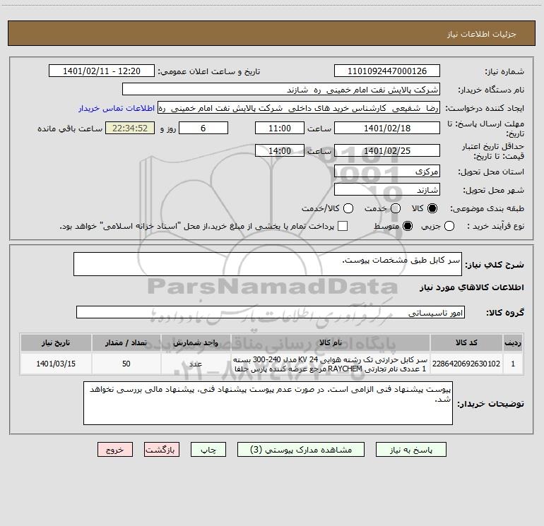 شرح کلی نیاز: سر کابل طبق مشخصات پیوست.
