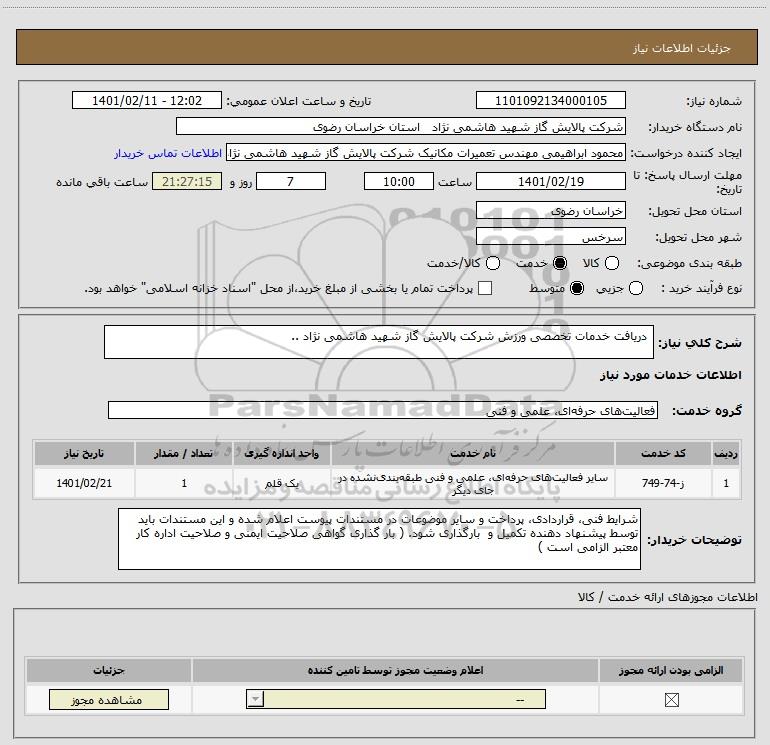 نام دستگاه خریدار:شرکت پالایش گاز شهید هاشمی نژاد استان خراسان رضوی