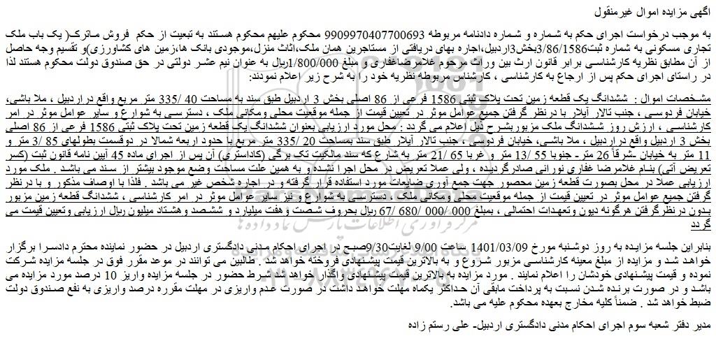 مزایده فروش ششدانگ یک قطعه زمین تحت پلاک ثبتی 1586 فرعی از 86 اصلی بخش 3 , مزایده فروش ششدانگ یک قطعه زمین تحت پلاک ثبتی 1586 فرعی از 86 اصلی بخش 3