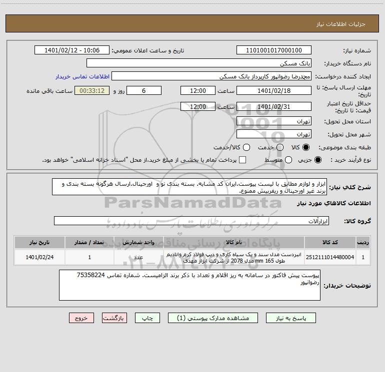 استعلام بها و موضوع استعلام استعلام ابزار و لوازم مطابق با لیست پیوست.ایران کد مشابه. بسته بندی نو و اورجینال.ارسال هرگونه بسته بندی و برند غیر اورجینال و ریفربیش ممنوع. به اطلاع کلیه شرکتها و افراد متخصص واجد شرایط میرساند، آگهی گذار در نظر دارد از طریق استعلام بها، نسبت به انتخاب و دریافت پیشنهادات اقدام نماید. این استعلام با کد آگهی ثبت شده در سامانه خبرگزاری پارس نماد : 4468078 منتشر شده است. مشخصات استعلام : تاریخ شروع استعلام: 1401/02/12 آخرین مهلت ارسال پیشنهاد قیمت : 1401/02/18 و محل اجرای پروژه : استان تهران میباشد. استعلام قیمت مورد درخواست : استعلام ابزار و لوازم مطابق با لیست پیوست.ایران کد مشابه. بسته بندی نو و اورجینال.ارسال هرگونه بسته بندی و برند غیر اورجینال و ریفربیش ممنوع. با دستهبندیهای تخصصی و گروه های مرتبط : ابزار و یراق آلات, استعلام اطلاع رسانی میگردد. شرایط شرکت در استعلام آنلاین : ابتدا ثبت نام در سامانه استعلام پارس نماد و تکمیل مدارک موردنیاز و بارگذاری در سامانه رعایت تمامی ضوابط و الزامات مندرج در اسناد استعلام است.