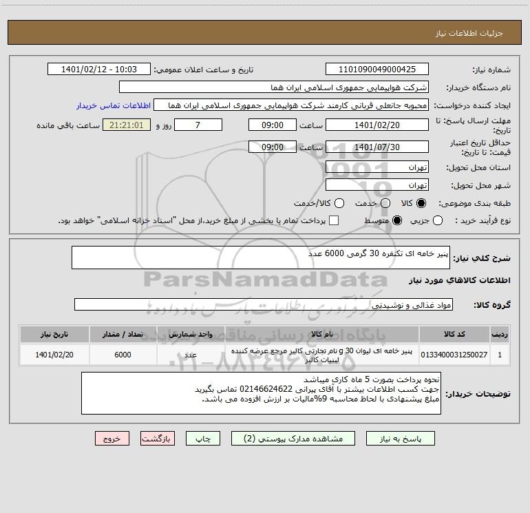 شرح کلی نیاز: پنیر خامه ای تکنفره 30 گرمی 6000 عدد