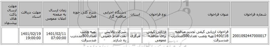 مناقصه، فراخوان ارزیابی کیفی تجدید مناقصه 1400/18تهیه ونصب تعداد500عدددرب ضدسرقت از کلیه افراد متخصص و شرکت‌ها واجد شرایط دعوت به عمل می‌آید در مناقصه با کد خبرگزاری پارس نماد: 4468308 شرکت نمایند. این مناقصه در تاریخ 1401/02/12 شروع و مهلت آن تا تاریخ 1401/02/19 میباشد.