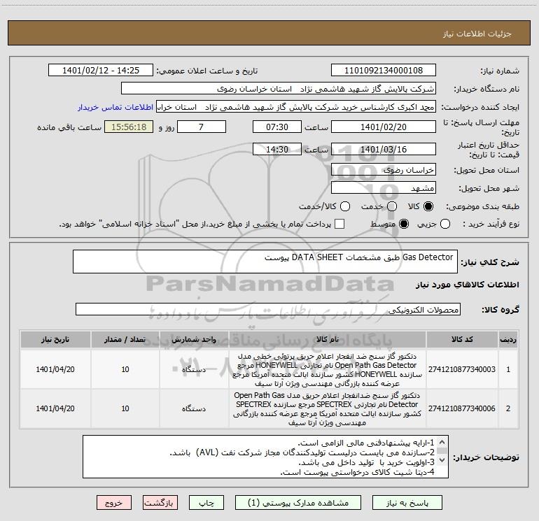 شرح کلی نیاز: Gas Detector طبق مشخصات DATA SHEET پیوست