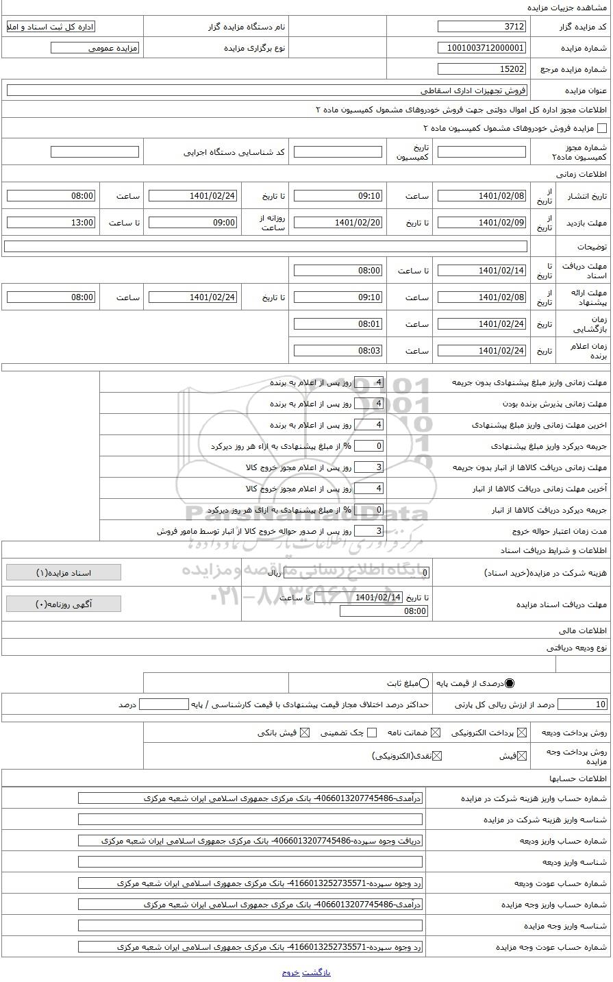 شماره حساب واریز وجه مزایده | درآمدی-4066013207745486- بانک مرکزی جمهوری اسلامی ایران شعبه مرکزی |