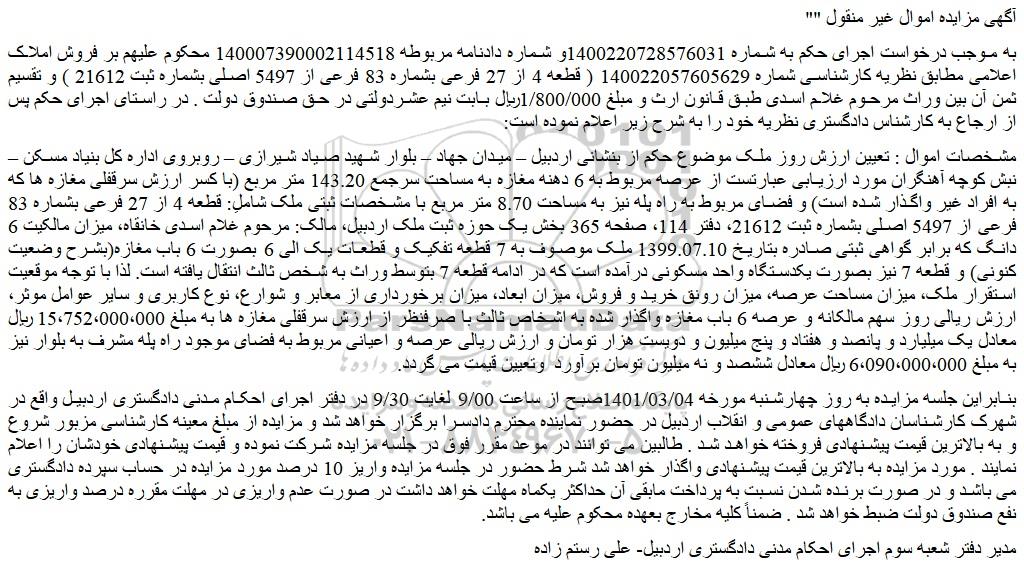 مشخصات اموال : تعیین ارزش روز ملک موضوع حکم از بنشانی اردبیل – میدان جهاد – بلوار شهید صیاد شیرازی – روبروی اداره کل بنیاد مسکن – نبش کوچه آهنگران مورد ارزیابی عبارتست از عرصه مربوط به 6 دهنه مغازه به مساحت سرجمع 143.20 متر مربع (با کسر ارزش سرقفلی مغازه ها که به افراد غیر واگذار شده است) و فضای مربوط به راه پله نیز به مساحت 8.70 متر مربع با مشخصات ثبتی ملک شاملِ: قطعه 4 از 27 فرعی بشماره 83 فرعی از 5497 اصلی بشماره ثبت 21612، دفتر 114، صفحه 365 بخش یک حوزه ثبت ملک اردبیل، مالک: مرحوم غلام اسدی خانقاه، میزان مالکیت 6 دانگ که برابر گواهی ثبتی صادره بتاریخ 1399.07.10 ملک موصوف به 7 قطعه تفکیک و قطعات یک الی 6 بصورت 6 باب مغازه(بشرح وضعیت کنونی) و قطعه 7 نیز بصورت یکدستگاه واحد مسکونی درآمده است که در ادامه قطعه 7 بتوسط وراث به شخص ثالث انتقال یافته است. لذا با توجه موقعیت استقرار ملک، میزان مساحت عرصه، میزان رونق خرید و فروش، میزان ابعاد، میزان برخورداری از معابر و شوارع، نوع کاربری و سایر عوامل موثر، ارزش ریالی روز سهم مالکانه و عرصه 6 باب مغازه واگذار شده به اشخاص ثالث با صرفنظر از ارزش سرقفلی مغازه ها به مبلغ 15،752،000،000 ریال معادل یک میلیارد و پانصد و هفتاد و پنج میلیون و دویست هزار تومان و ارزش ریالی عرصه و اعیانی مربوط به فضای موجود راه پله مشرف به بلوار نیز به مبلغ 6،090،000،000 ریال معادل ششصد و نه میلیون تومان برآورد  وتعیین قیمت می گردد.