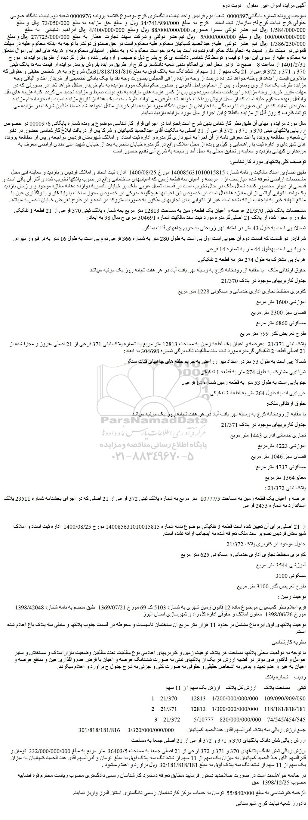 مال مورد مزایده و بهای آن طبق نظر کارشناس بدین شرح است:احتراما در اجرای قرار کارشناسی موضوع پرونده شماره بایگانی 0000976 در خصوص ارزیابی پلاکهای ثبتی 370 و 371 و 372 فرعی از 21 اصلی به مالکیت آقای عبدالحمید کمپانیان و شرکا پس از دریافت ابلاغ کارشناسی حضور در دفتر آن شعبه و مطالعه پرونده با اخذ معرفی نامه از آن اجرا به شهرداری گرمدره و اداره ثبت اسناد و املاک شهرستان فردیس مراجعه و پس از مطالعه پرونده های شهردای و اداره ثبت با راهنمایی و کیل پرونده از محل املاک واقع در گرمدره خیابان ناصریه یعد از خیابان شهید علی مددی اراضی معرف به مرغداری کیهانی بازدید و معاینه و تحقیق محلی به عمل آمد و نتیجه به شرح آتی تقدیم حضور است.