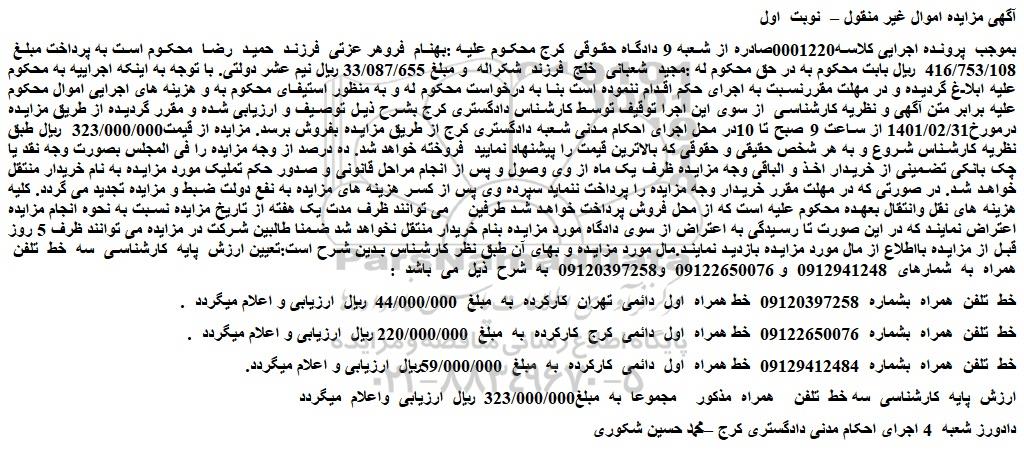 بموجب پرونده اجرایی کلاسه0001220صادره از شعبه 9 دادگاه حقوقی کرج محکوم علیه :بهنام فروهر عزتی فرزند حمید رضا محکوم است به پرداخت مبلغ 416/753/108 ریال بابت محکوم به در حق محکوم له :مجید شعبانی خلج فرزند شکراله و مبلغ 33/087/655 ریال نیم عشر دولتی. با توجه به اینکه اجراییه به محکوم علیه ابلاغ گردیده و در مهلت مقررنسبت به اجرای حکم اقدام ننموده است بنا به درخواست محکوم له و به منظور استیفای محکوم به و هزینه های اجرایی اموال محکوم علیه برابر متن آگهی و نظریه کارشناسی از سوی این اجرا توقیف توسط کارشناس دادگستری کرج بشرح ذیل توصیف و ارزیابی شده و مقرر گردیده از طریق مزایده درمورخ1401/02/31 از ساعت 9 صبح تا 10در محل اجرای احکام مدنی شعبه دادگستری کرج از طریق مزایده بفروش برسد. مزایده از قیمت323/000/000 ریال طبق نظریه کارشناس شروع و به هر شخص حقیقی و حقوقی که بالاترین قیمت را پیشنهاد نمایید فروخته خواهد شد. ده درصد از وجه مزایده را فی المجلس بصورت وجه نقد یا چک بانکی تضمینی از خریدار اخذ و الباقی وجه مزایده ظرف یک ماه از وی وصول و پس از انجام مراحل قانونی و صدور حکم تملیک مورد مزایده به نام خریدار منتقل خواهد شد. در صورتی که در مهلت مقرر خریدار وجه مزایده را پرداخت ننماید سپرده وی پس از کسر هزینه های مزایده به نفع دولت ضبط و مزایده تجدید می گردد. کلیه هزینه های نقل وانتقال بعهده محکوم علیه است که از محل فروش پرداخت خواهد شد طرفین می توانند ظرف مدت یک هفته از تاریخ مزایده نسبت به نحوه انجام مزایده اعتراض نمایند که در این صورت تا رسیدگی به اعتراض از سوی دادگاه مورد مزایده بنام خریدار منتقل نخواهد شد ضمنا طالبین شرکت در مزایده می توانند ظرف 5 روز قبل از مزایده بااطلاع از مال مورد مزایده بازدید نمایند.مال مورد مزایده و بهای آن طبق نظر کارشناس بدین شرح است:تعیین ارزش پایه کارشناسی سه خط تلفن همراه به شمارهای 0912941248 و 09122650076 و09120397258 به شرح ذیل می باشد :