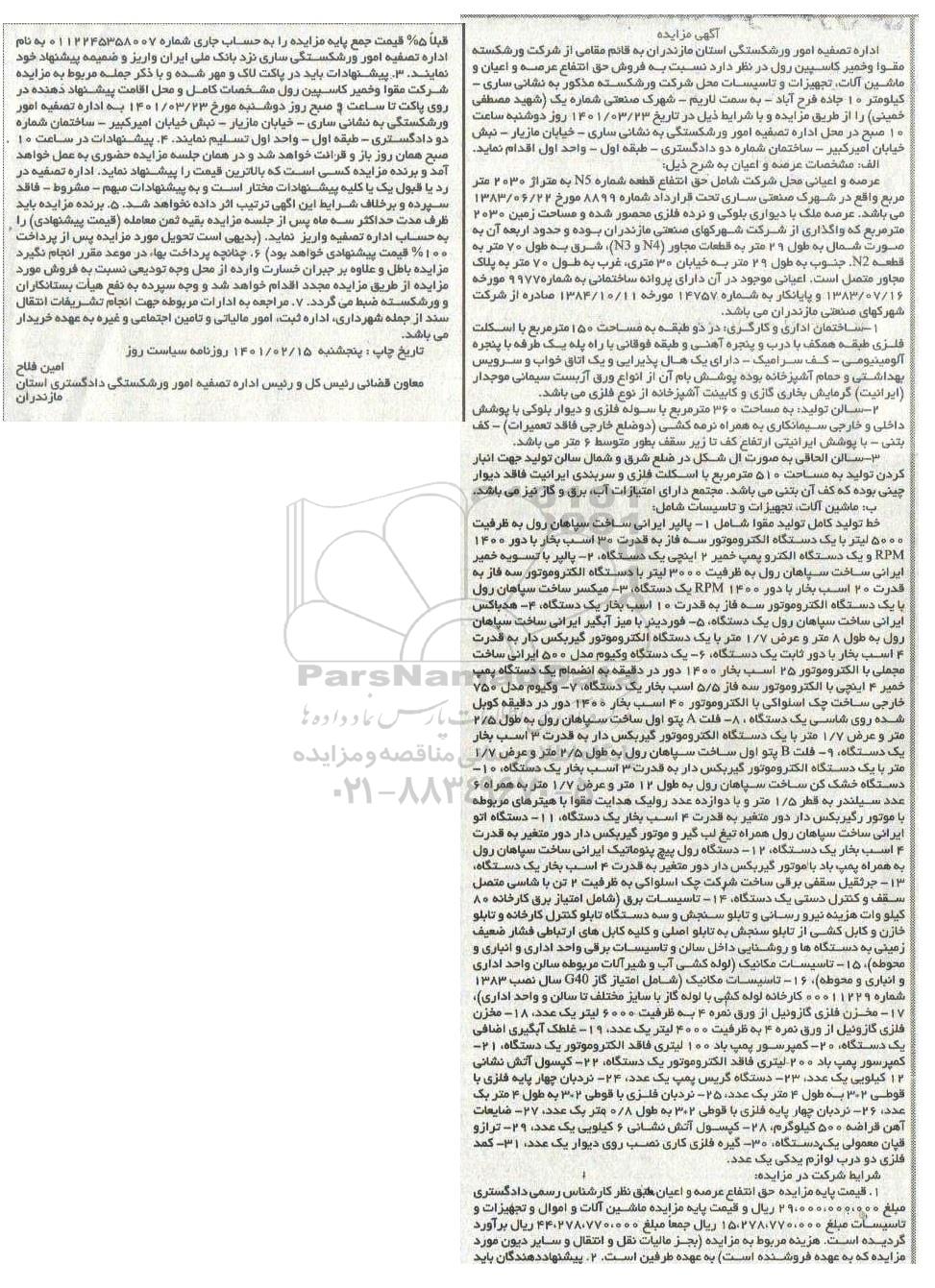 اداره تصفیه امور ورشکستگی استان مازندران به قائم مقامی از شرکت ورشکسته مقوا و خمیر کاسپین رول در نظر دارد نسبت به فروش حق انتفاع عرصه و اعیان و ماشین آلات، تجهیزات و تاسیسات محل شرکت ورشکسته مذکور به نشانی ساری - کیلومتر 10 جاده فرح آباد - به سمت لاریم - شهرک صنعتی شماره یک (شهید مصطفی خمینی) را از طریق مزایده و با شرایط ذیل در تاریخ 1401.3.23 روز دوشنبه ساعت 10 صبح در محل اداه تصفیه امور ورشکسته به نشانی ساری - خیابان مازیار - نبش خیابان امیرکبیر - ساخمان شماره دو دادگستری - طبقه اول - واحد اور اقدام نماید.