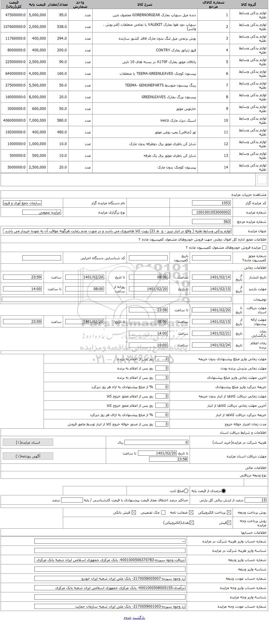 مزایده ، لوازم یدکی وسایط نقلیه ( واقع در انبار تبریز - ج ط 21) رویت کالا هاضروری می باشد و در صورت عدم رعایت هرگونه عواقب آن ب, مزایده ، لوازم یدکی وسایط نقلیه ( واقع در انبار تبریز - ج ط 21) رویت کالا هاضروری می باشد و در صورت عدم رعایت هرگونه عواقب آن ب