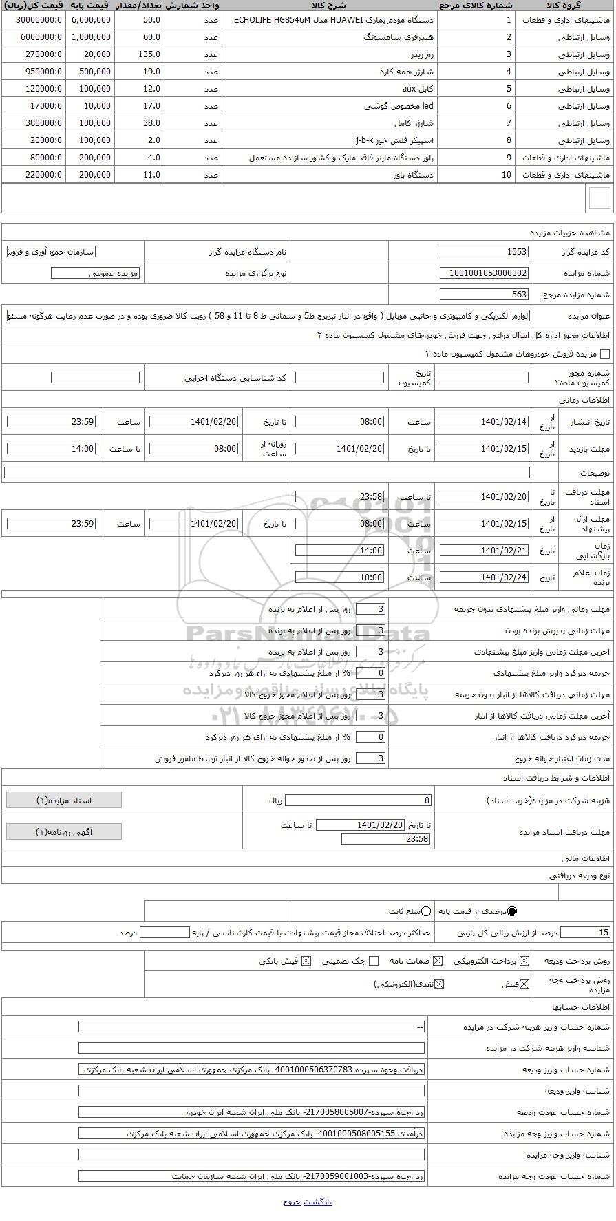 کد مزایده گزار | 1053 | نام دستگاه مزایده گزار | سازمان جمع آوری و فروش اموال تملیکی | |