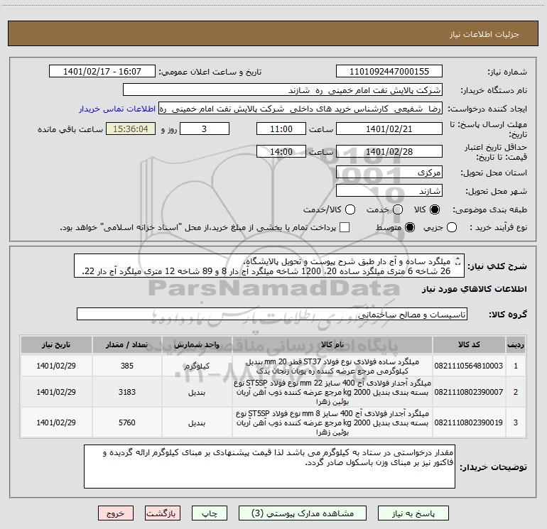 شرح کلی نیاز: میلگرد ساده و آج دار طبق شرح پیوست و تحویل پالایشگاه.