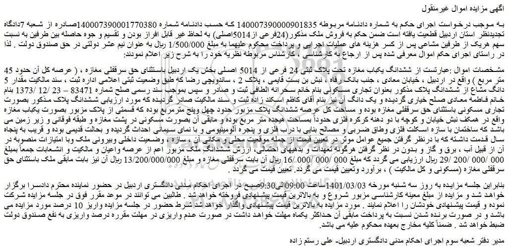 به موجب درخواست اجرای حکم به شماره دادنامه مربوطه 140007390000901835 که حسب دادنامه شماره 140007390001770380صادره از شعبه 7دادگاه تجدیدنظر استان اردبیل قطعیت یافته است ضمن حکم به فروش ملک مذکور(24فرعی از5014اصلی) به لحاظ غیر قابل افراز بودن و تقسیم و جوه حاصله بین طرفین به نسبت سهم هریک از طرفین مشاعی پس از کسر هزینه های عملیات اجرایی و پرداخت محکوم علیهما به مبلغ 1/500/000 ریال به عنوان نیم عشر دولتی در حق صندوق دولت . لذا در راستای اجرای حکم اموال معرفی شده پس از ارجاع به کارشناسی ، کارشناس مربوطه نظریه خود را به شرح زیر اعلام نمودند: