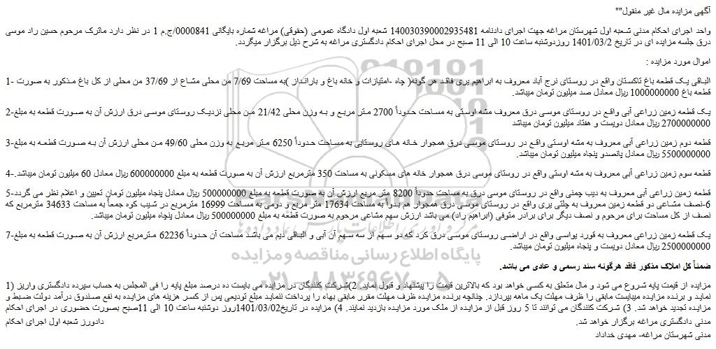 واحد اجرای احکام مدنی شعبه اول شهرستان مراغه جهت اجرای دادنامه 140030390002935481 شعبه اول دادگاه عمومی (حقوقی) مراغه شماره بایگانی 0000841/ج.م 1 در نظر دارد ماترک مرحوم حسین راد موسی درق جلسه مزایده ای در تاریخ 1401/03/2 روزدوشنبه ساعت 10 الی 11 صبح در محل اجرای احکام دادگستری مراغه به شرح ذیل برگزار میگردد.