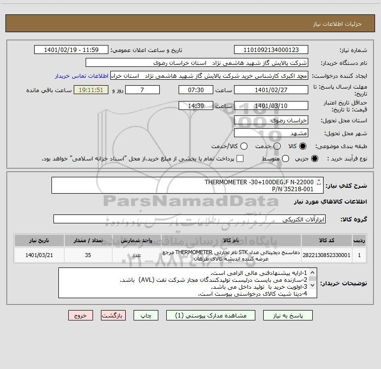 نام دستگاه خریدار:شرکت پالایش گاز شهید هاشمی نژاد استان خراسان رضوی