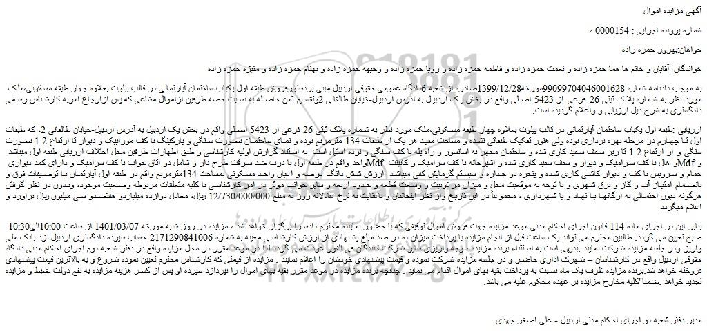 به موجب دادنامه شماره 99099704046001628مورخه1399/12/28صادره از شعبه 6دادگاه عمومی حقوقی اردبیل مبنی بردستورفروش طبقه اول یکباب ساختمان آپارتمانی در قالب پیلوت بعلاوه چهار طبقه مسکونی،ملک مورد نظر به شماره پلاک ثبتی 26 فرعی از 5423 اصلی واقع در بخش یک اردبیل به آدرس اردبیل-خیابان طالقانی 2وتقسیم ثمن حاصله به نسبت حصه طرفین ازاموال مشاعی که پس ازارجاع امربه کارشناس رسمی دادگستری به شرح ذیل ارزیابی و واعلام گردیده است.