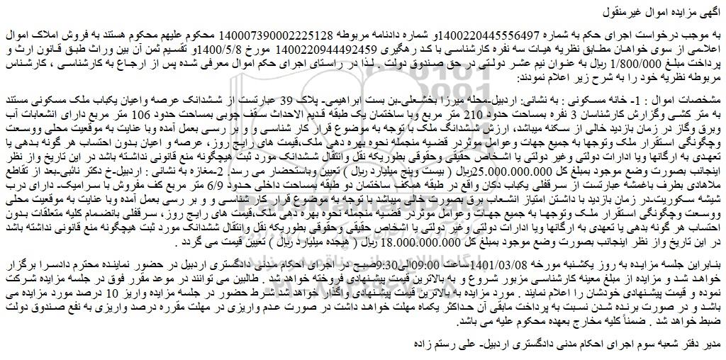 بنابراین جلسه مزایده به روز یکشنبه مورخه 1401/03/08ساعت 09:00الی9:30صبح در اجرای احکام مدنی دادگستری اردبیل در حضور نماینده محترم دادسرا برگزار خواهد شد و مزایده از مبلغ معینه کارشناسی مزبور شروع و به بالاترین قیمت پیشنهادی فروخته خواهد شد . طالبین می توانند در موعد مقرر فوق در جلسه مزایده شرکت نموده و قیمت پیشنهادی خودشان را اعلام نمایند . مورد مزایده به بالاترین قیمت پیشنهادی واگذار خواهد شد شرط حضور در جلسه مزایده واریز 10 درصد مورد مزایده می باشد و در صورت برنده شدن نسبت به پرداخت مابقی آن حداکثر یکماه مهلت خواهد داشت در صورت عدم واریزی در مهلت مقرره درصد واریزی به نفع صندوق دولت ضبط خواهد شد . ضمناً کلیه مخارج بعهده محکوم علیه می باشد.