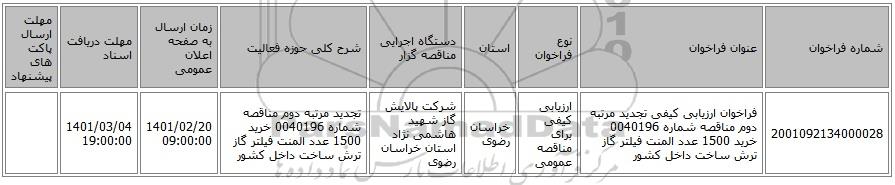 مناقصه، فراخوان ارزیابی کیفی تجدید مرتبه دوم مناقصه شماره 0040196 خرید 1500 عدد المنت فیلتر گاز ترش ساخت داخل کشور, مناقصه، فراخوان ارزیابی کیفی تجدید مرتبه دوم مناقصه شماره 0040196 خرید 1500 عدد المنت فیلتر گاز ترش ساخت داخل کشور