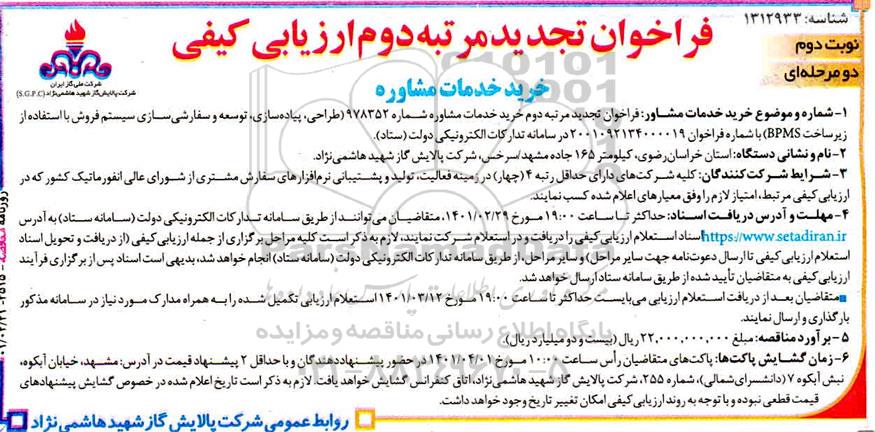 1- شماره و موضوع خرید خدمات مشاور : فراخوان تجدید مرتبه دوم خدمات مشاوره 978352 (طراحی، پیاده سازی، توسعه و سفارشی سازی سیستم فروش با استفاده از زیرساخت BPMS) با شماره فراخوان 2001092134000019 در سامانه تدارکات الکترونیکی دولت ستاد