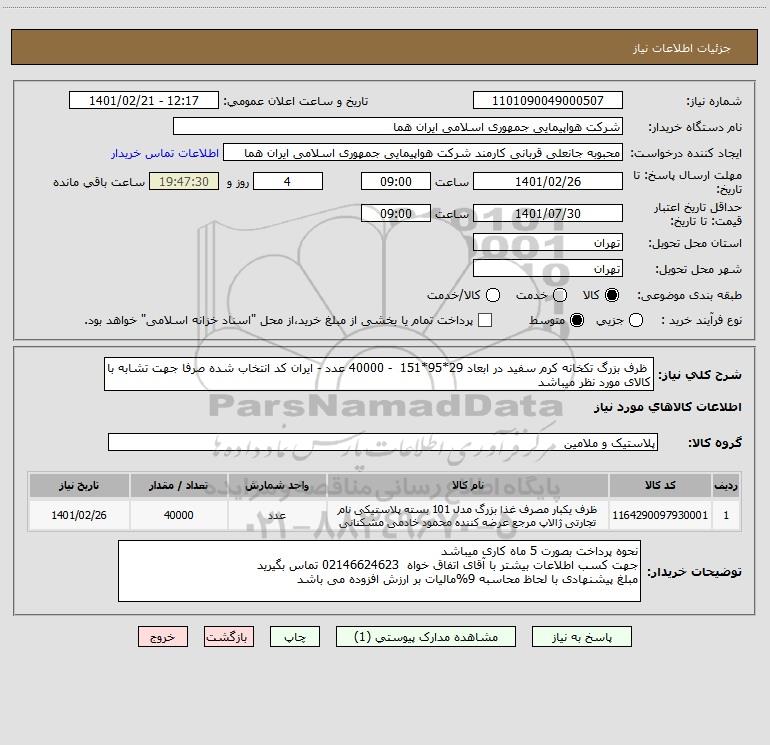شرح کلی نیاز: ظرف بزرگ تکخانه کرم سفید در ابعاد 29*95*151 - 40000 عدد - ایران کد انتخاب شده صرفا جهت تشابه با کالای مورد نظر میباشد