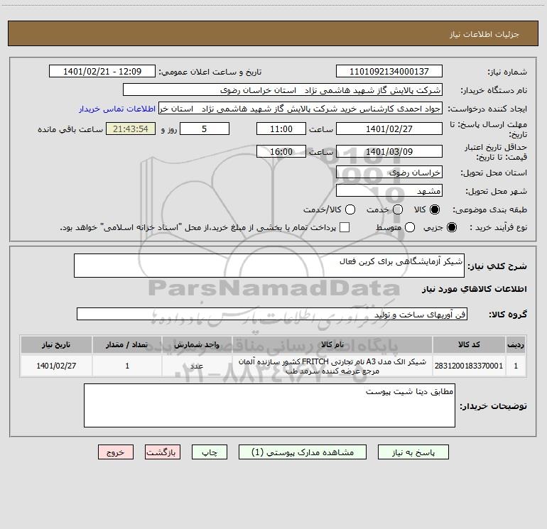 نام دستگاه خریدار:شرکت پالایش گاز شهید هاشمی نژاد استان خراسان رضوی