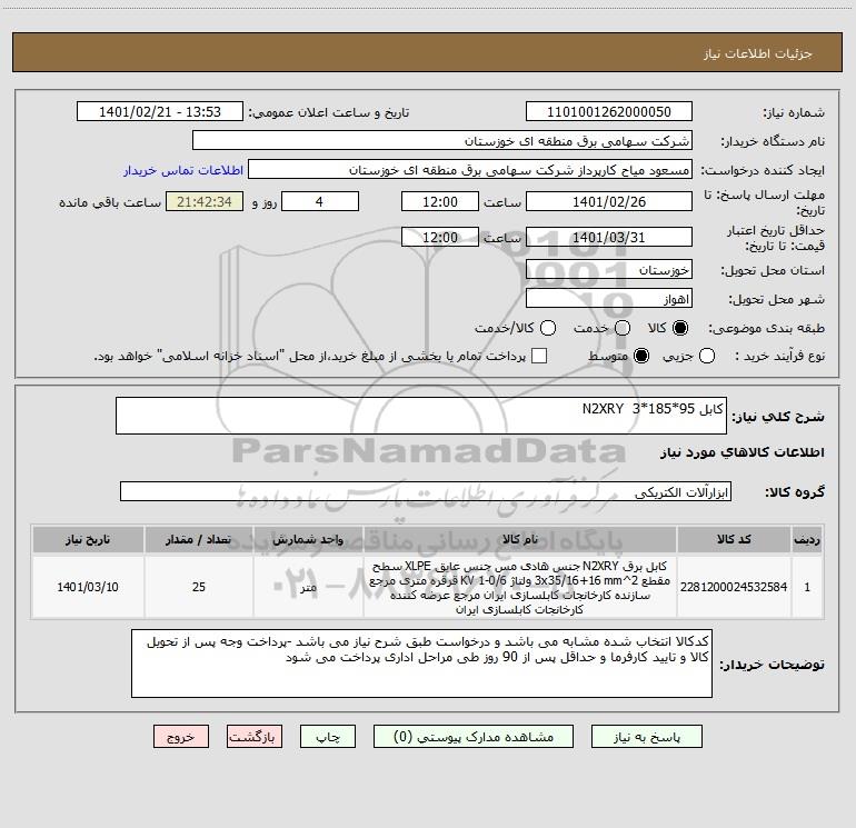 شرح کلی نیاز: کابل 95*185*3 N2XRY