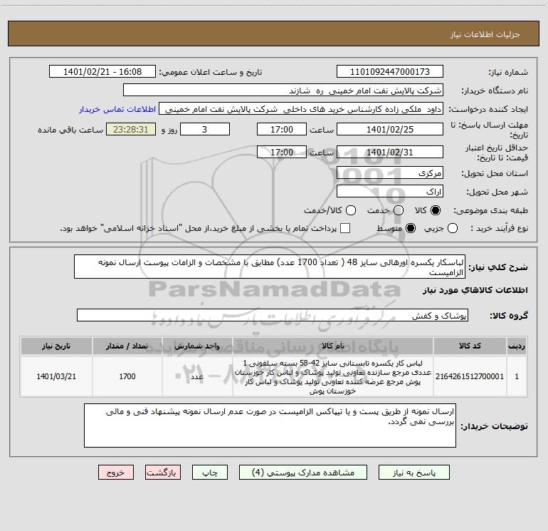 شرح کلی نیاز: لباسکار یکسره اورهالی سایز 48 ( تعداد 1700 عدد) مطابق با مشخصات و الزامات پیوست ارسال نمونه الزامیست