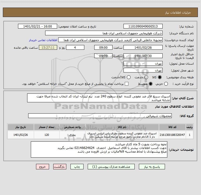 شرح کلی نیاز: اسپری سریع الاثر ضد عفونی کننده انواع سطوح 240 عدد نیم لیتری- ایران کد انتخاب شده صرفا جهت تشابه میباشد