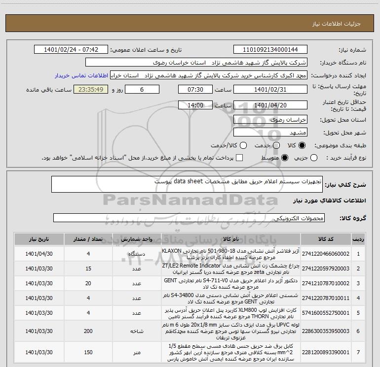 نام دستگاه خریدار:شرکت پالایش گاز شهید هاشمی نژاد استان خراسان رضوی