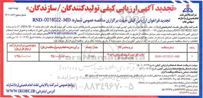 شرکت پالایش نفت امام خمینی (ره) در نظر دارد فراخوان ارزیابی کیفی جهت برگزاری مناقصه عمومی یک مرحله ای خرید جاذب کلر جهت ظروف کلرزدای واحد 02 (V-260 A/B) به شماره RND-0018022-MD و شماره فراخوان 2001092447000027 را از طریق سامانه تدارکات الکترونیکی دولت برگزار نماید. کلیه مراحل برگزاری فراخوان ارزیابی کیفی از دریافت و تحویل اسناد استعلام ارزیابی کیفی تا ارسال دعوتنامه جهت سایر مراحل مناقصه از طریق درگاه سامانه تدارکات الکترونیکی دولت ستاد به آدرس ستاد ایران انجام خواهد شد. لازم است مناقصه گران در صورت عدم عضویت قبلی مراحل ثبت نام در سایت مذکور و دریافت گواهی امضای الکترونیکی را جهت شرکت در مناقصه محقق سازند. تاریخ انتشار فراخوان در سامانه تاریخ 1401.2.24 می باشد. اطلاعات و اسناد مناقصه عمومی پس از برگزاری فرآیند ارزیابی کیفی و ارسال دعوتنامه از طریق سامانه ستاد به مناقصه گران ارسال خواهد شد.