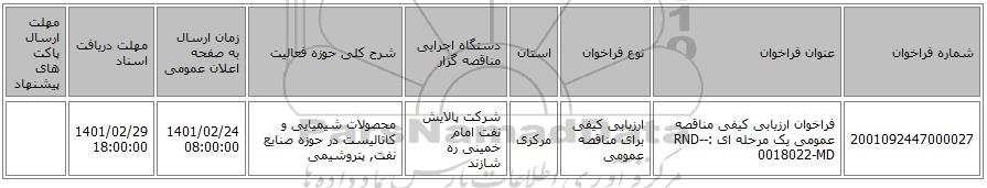 | 2001092447000027 | فراخوان ارزیابی کیفی مناقصه عمومی یک مرحله ای :RND--0018022-MD | ارزیابی کیفی برای مناقصه عمومی | مرکزی | شرکت پالایش نفت امام خمینی ره شازند | محصولات شیمیایی و کاتالیست در حوزه صنایع نفت, پتروشیمی | 1401/02/24 08:00:00 | 1401/02/29 18:00:00 |