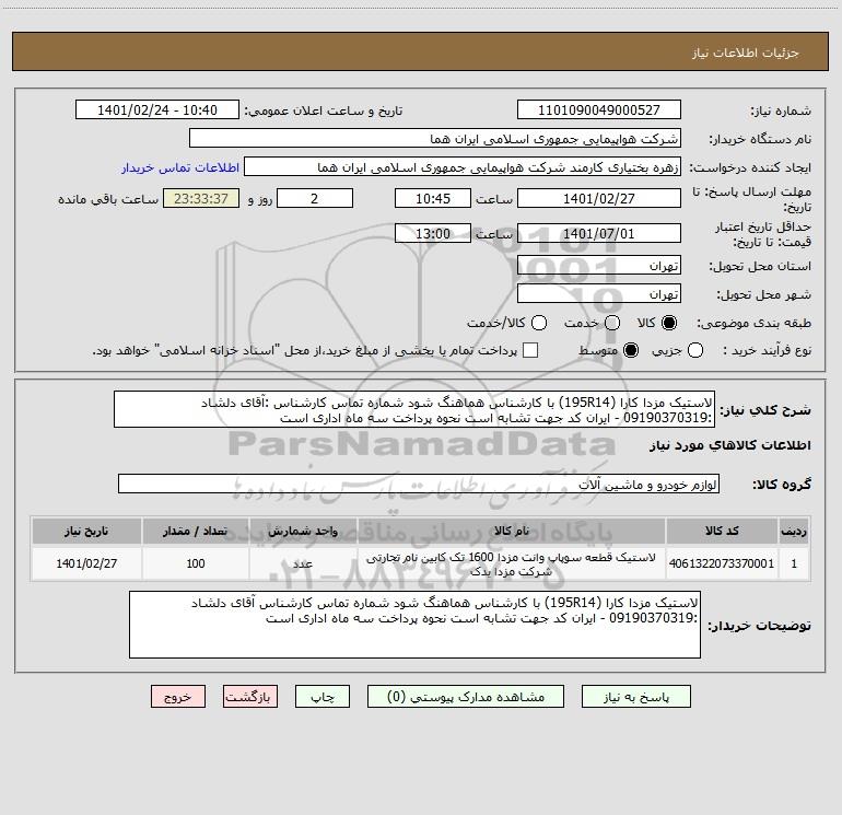 شرح کلی نیاز: لاستیک مزدا کارا (195R14) با کارشناس هماهنگ شود شماره تماس کارشناس :آقای دلشاد :09190370319 - ایران کد جهت تشابه است نحوه پرداخت سه ماه اداری است