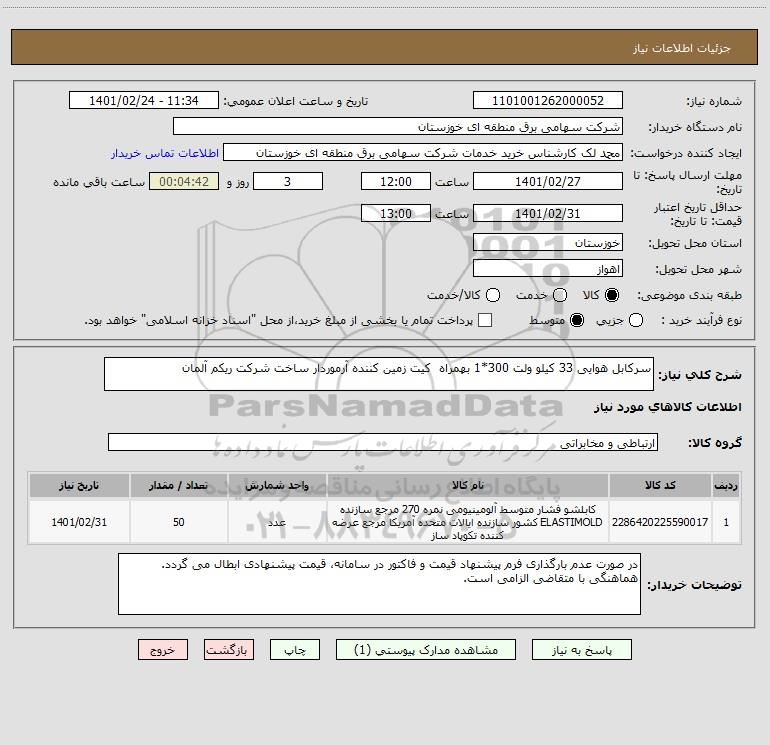 شرح کلی نیاز: سرکابل هوایی 33 کیلو ولت 300*1 بهمراه کیت زمین کننده آرموردار ساخت شرکت ریکم آلمان