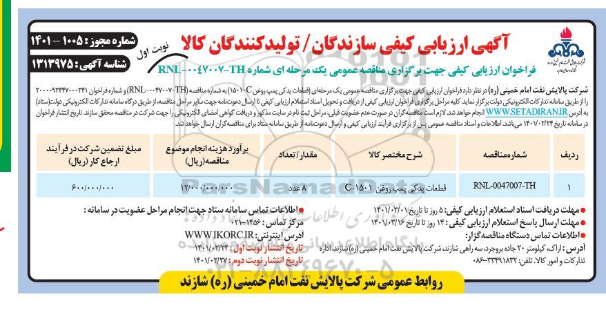 شرکت پالایش نفت امام خمینی (ره) در نظر دارد فراخوان ارزیابی کیفی جهت برگزاری مناقصه عمومی یک مرحله ای قطعات یدکی پمپ روغن 1501-c- به شماره مناقصه RNL-0047007-TH و شماره فراخوان 2000092447000241 را از طریق سامانه تدارکات الکترونیکی دولت برگزار نماید. کلیه مراحل برگزاری فراخوان ارزیابی کیفی از دریافت و تحویل اسناد استعلام ارزیابی کیفی تا ارسال دعوتنامه جهت سایر مراحل مناقصه از طریق درگاه سامانه تدارکات الکترونیکی دولت ستاد ایران انجام خواهد شد. لازم است مناقصه گران در صورت عدم عضویت قبلی مراحل ثبت نام در سایت مذکور و دریافت گواهی امضای الکترونیکی را جهت شرکت در مناقصه محقق سازند. تاریخ انتشار فراخوان در سامانه تاریخ 1401.2.24 می باشد. اطلاعات و اسناد مناقصه عمومی پس از برگزاری فرآیند ارزیابی کیفی و ارسال دعوتنامه از طریق سامانه ستاد به مناقصه گران ارسال خواهد شد.