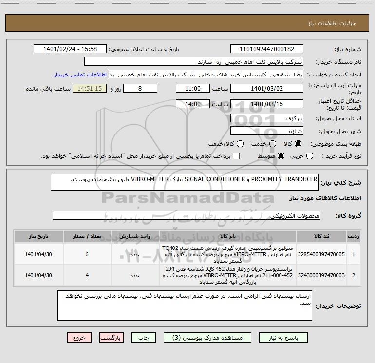 شرح کلی نیاز: PROXIMITY TRANDUCER و SIGNAL CONDITIONER مارک VIBRO-METER طبق مشخصات پیوست.