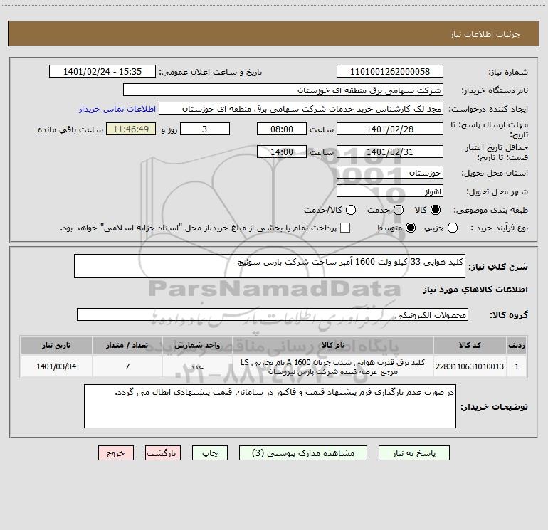 شرح کلی نیاز: کلید هوایی 33 کیلو ولت 1600 آمپر ساخت شرکت پارس سوئیچ