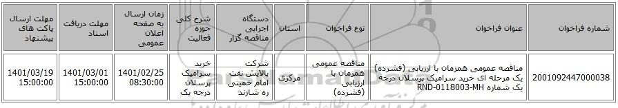 مناقصه، مناقصه عمومی همزمان با ارزیابی (فشرده) یک مرحله ای خرید سرامیک پرسلان درجه یک شماره RND-0118003-MH, مناقصه عمومی همزمان با ارزیابی (فشرده) یک مرحله ای خرید سرامیک پرسلان درجه یک شماره RND-0118003-MH