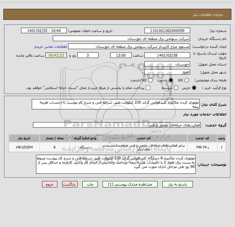 شرح کلی نیاز: موتوری کردن مکانیزم کلیدهوایی گراند 230 کیلوولت طبق شرایط فنی و شرح کار پیوست با احتساب هزینه بیمه
