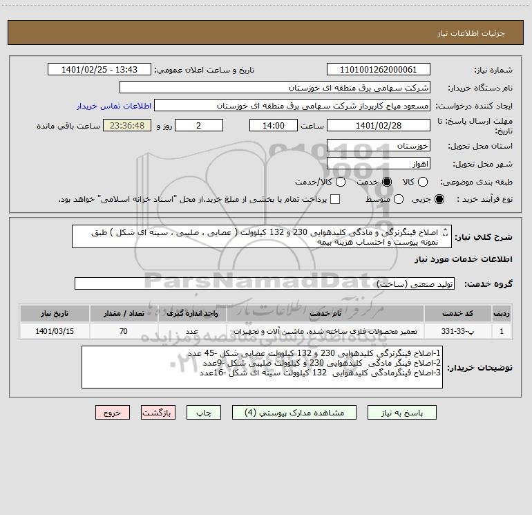 شرح کلی نیاز: اصلاح فینگرنرگی و مادگی کلیدهوایی 230 و 132 کیلوولت ( عصایی ، صلیبی ، سینه ای شکل ) طبق نمونه پیوست و احتساب هزینه بیمه