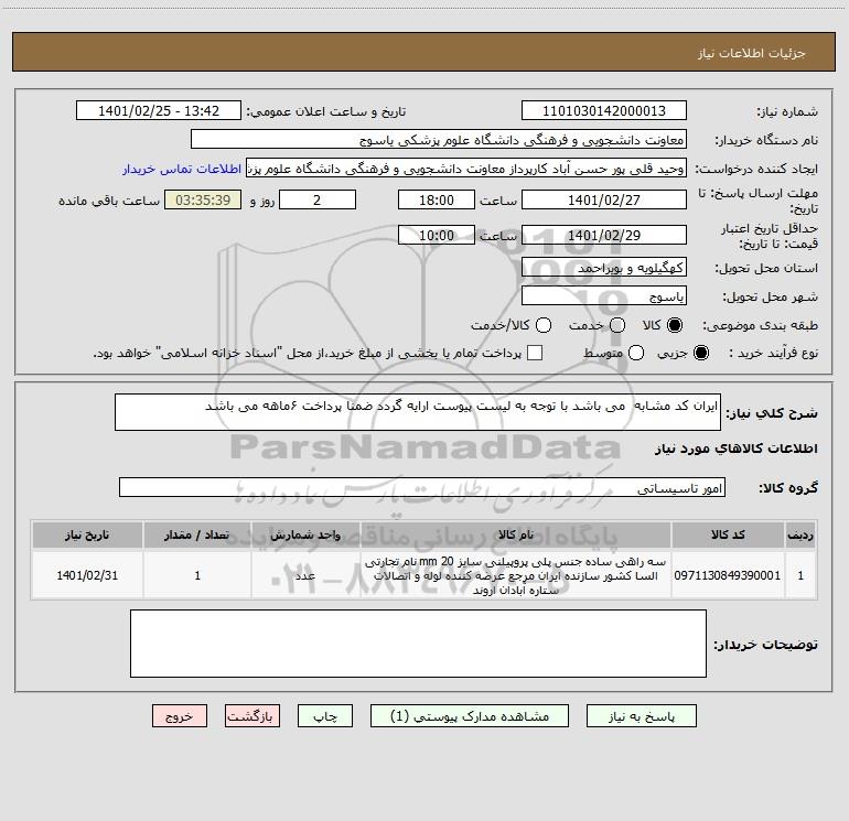 استعلام بها و موضوع استعلام استعلام ایران کد مشابه می باشد با توجه به لیست پیوست ارایه گردد ضمنا پرداخت ۶ماهه می باشد به اطلاع کلیه شرکتها و افراد متخصص واجد شرایط میرساند، آگهی گذار در نظر دارد از طریق استعلام بها، نسبت به انتخاب و دریافت پیشنهادات اقدام نماید. این استعلام با کد آگهی ثبت شده در سامانه خبرگزاری پارس نماد : 4502714 منتشر شده است. مشخصات استعلام : تاریخ شروع استعلام: 1401/02/25 آخرین مهلت ارسال پیشنهاد قیمت : 1401/02/27 و محل اجرای پروژه : استان کهگیلویه و بویراحمد میباشد. استعلام قیمت مورد درخواست : استعلام ایران کد مشابه می باشد با توجه به لیست پیوست ارایه گردد ضمنا پرداخت ۶ماهه می باشد با دستهبندیهای تخصصی و گروه های مرتبط : تاسیسات ساختمانی, لوله و اتصالات, استعلام اطلاع رسانی میگردد.