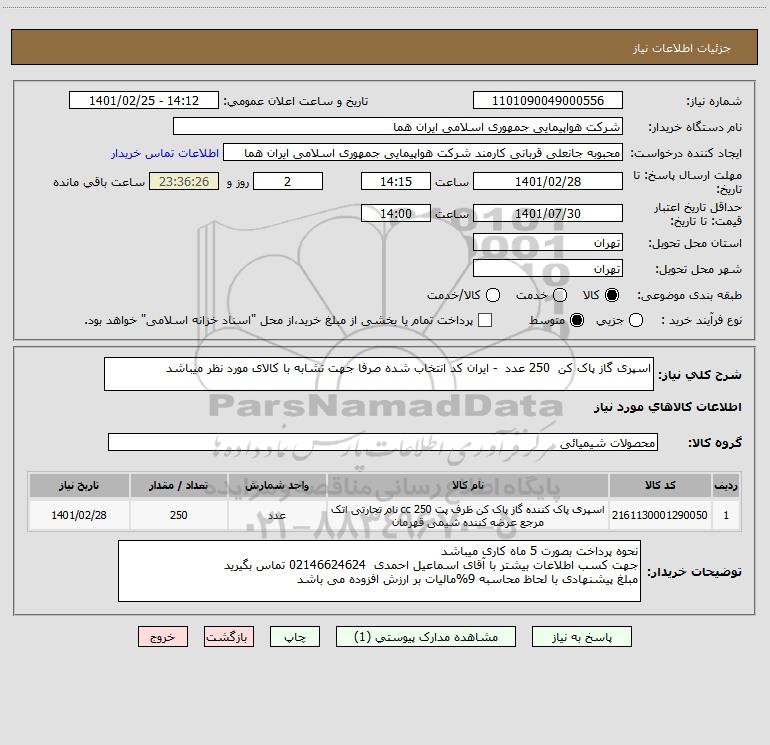 شرح کلی نیاز: اسپری گاز پاک کن 250 عدد - ایران کد انتخاب شده صرفا جهت تشابه با کالای مورد نظر میباشد