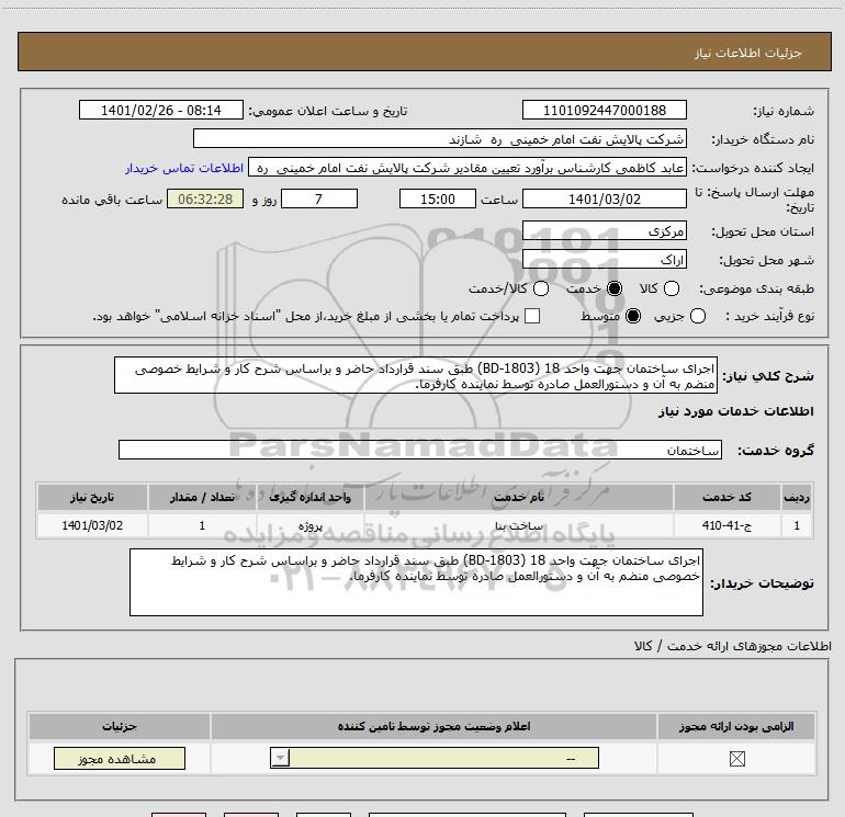 شرح کلی نیاز: اجرای ساختمان جهت واحد 18 (BD-1803) طبق سند قرارداد حاضر و براساس شرح کار و شرایط خصوصی منضم به آن و دستورالعمل صادره توسط نماینده کارفرما.